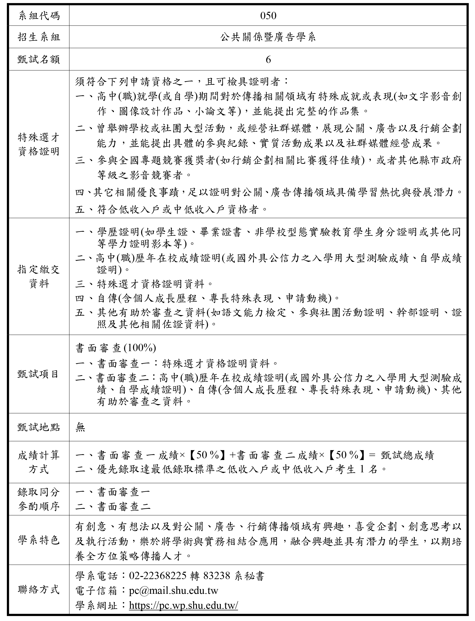 【115學年度學士班特殊選才招生簡章分則及書面審查準備指引公告】 115學年度世新大學學士班特殊選才招生最新消息查詢請點此 115學年度學士班特殊選才招生簡章公告 115公共關係暨廣告學系大學特殊選才招生-書面審查準備指引