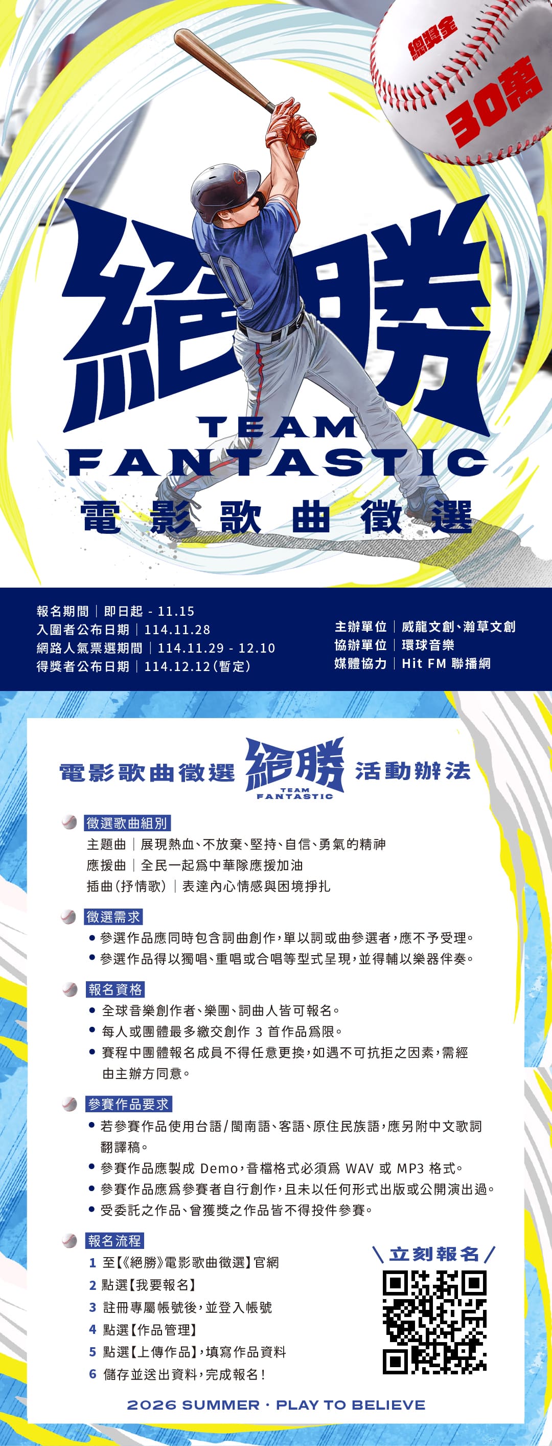 我們誠摯邀請全球音樂創作者參與 《絕勝》電影歌曲徵選,用音樂記錄這份熱血,創作出能代表電影精神、激勵人心、傳唱世代的年度主題曲。入選作品將在本片配樂老師的專業指導與製作下,打磨成最適合電影的歌曲,成為凝聚全民情感的重要篇章。