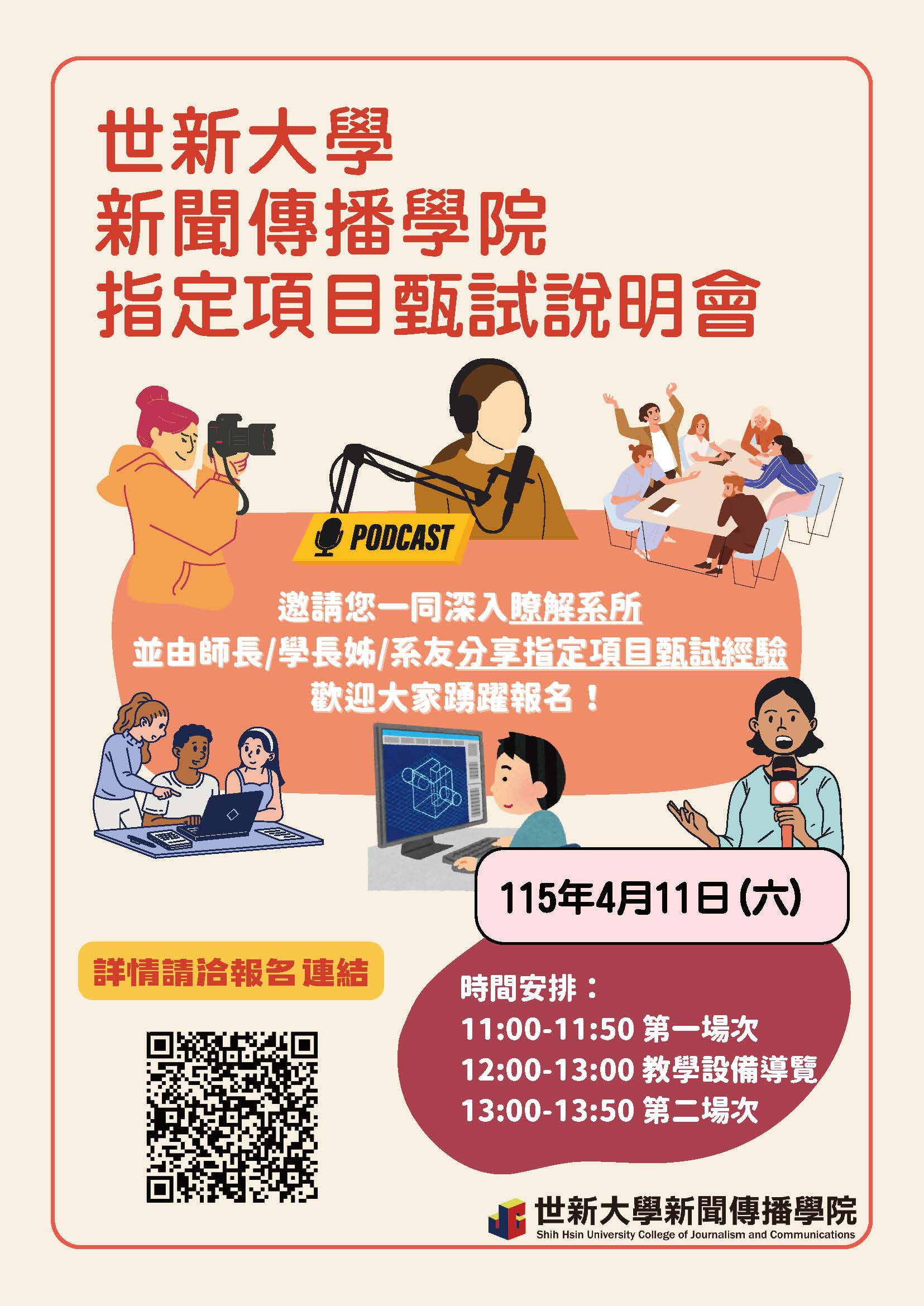 世新大學的新聞傳播學院共有8個不同的科系,邀請您一同深入瞭解系所,有師長、學長姊、系友分享指定項目甄試經驗,歡迎大家踴躍報名。