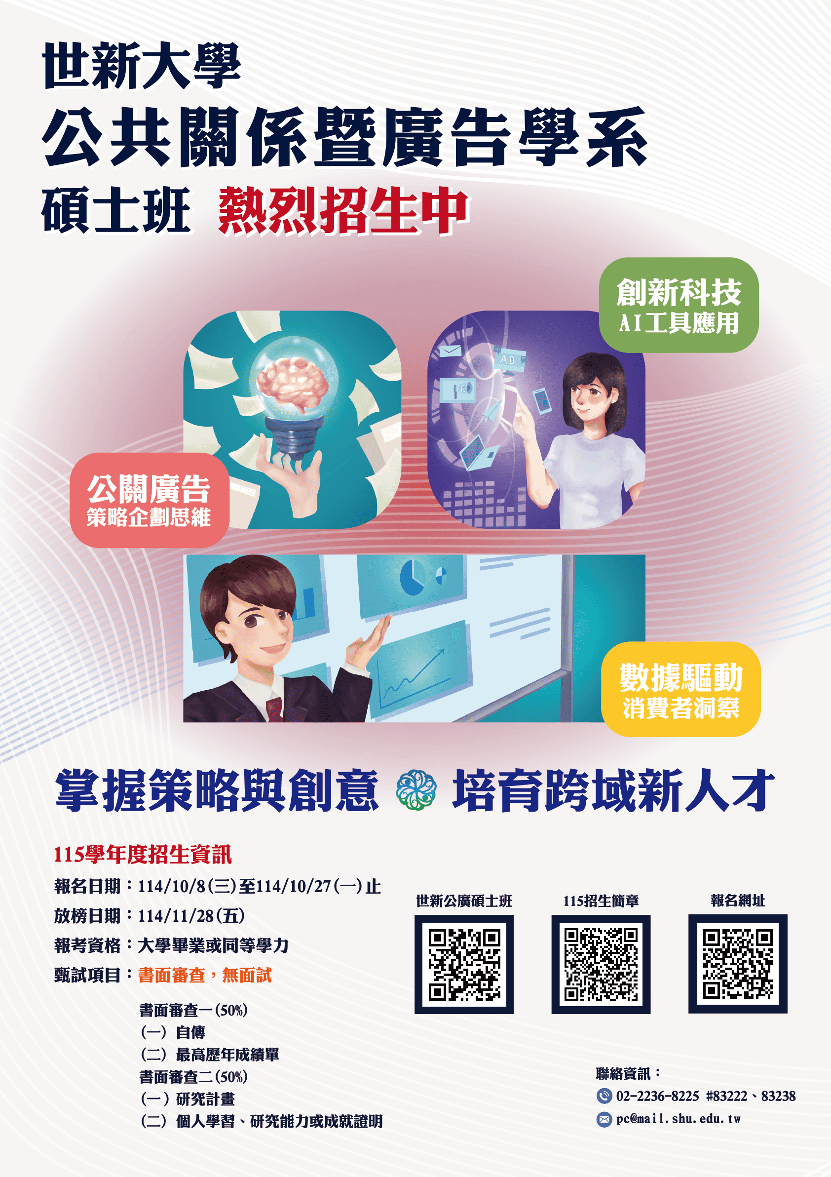 歡迎踴躍來電索取相關優惠推薦函及轉知有意願跨領域、跨科系學習的學生來就讀公廣系碩士班喔!