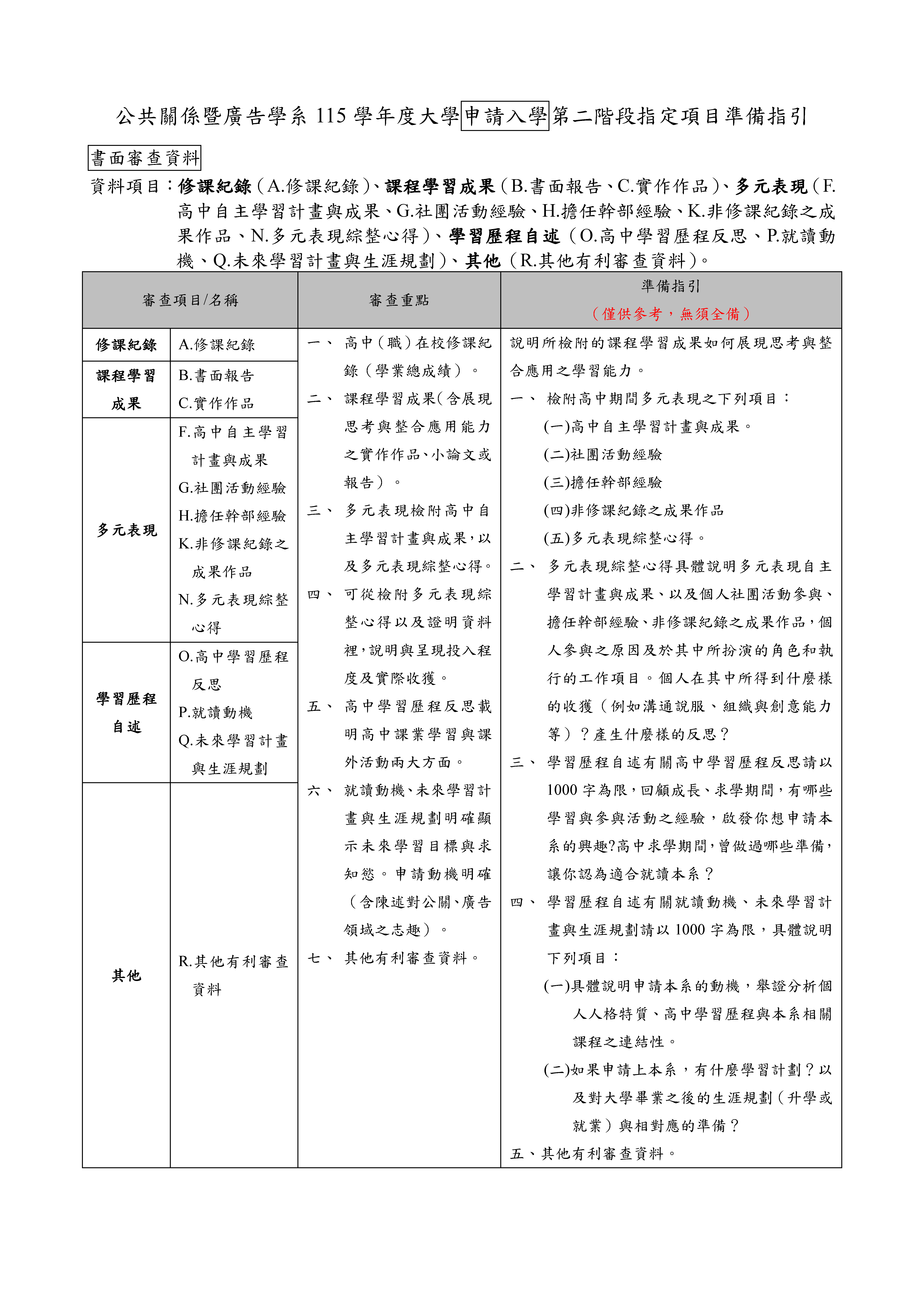公共關係暨廣告學系115學年度大學申請入學第二階段指定項目準備指引