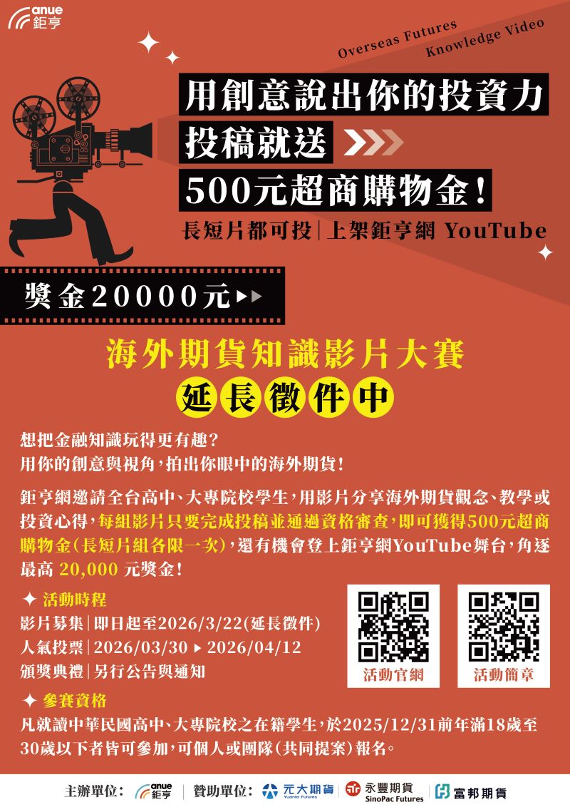 由鉅亨網(Anue)主辦之「海外期貨知識影片大賽」現正熱烈徵件中!本競賽鼓勵學生跨越學科限制,以創意影音呈現數位金融知識。