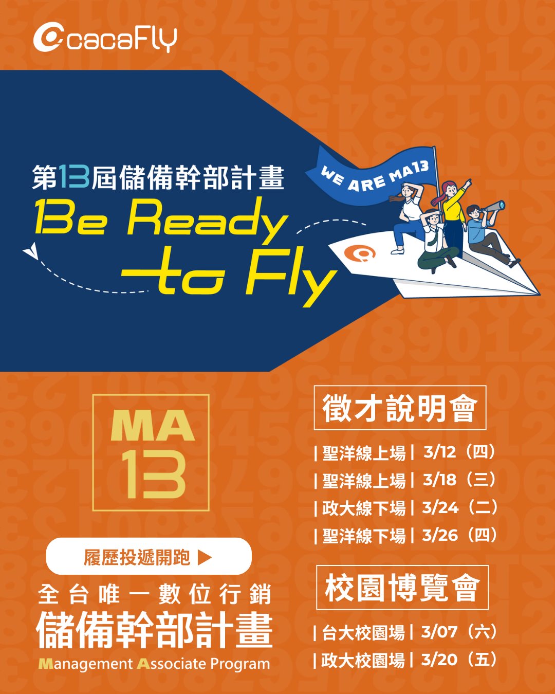 台灣最大數位行銷集團 cacaFly 聖洋科技儲備幹部第 13 屆徵才計畫現正開始!在 cacaFly,我們不為你的職涯設限,而是提供你起飛的跑道。你的極限在哪裡,天空就在哪裡!