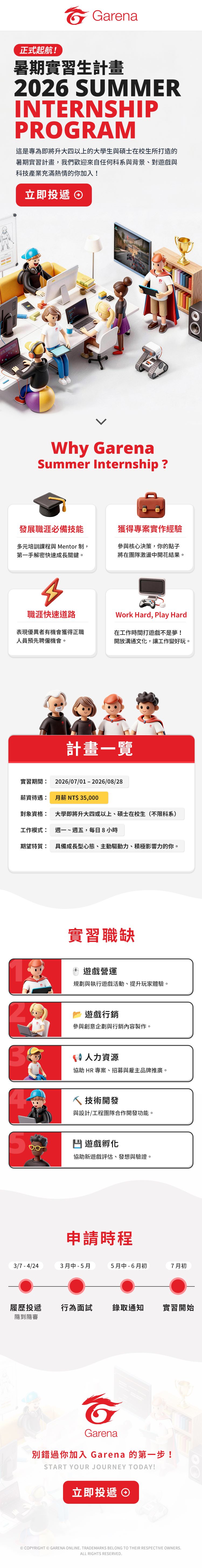 Garena Taiwan 2026 暑期實習生計畫 (Summer Internship Program) 已正式啟動,誠摯邀請優秀、對遊戲或科技業有熱忱的同學加入,與我們並肩作戰!